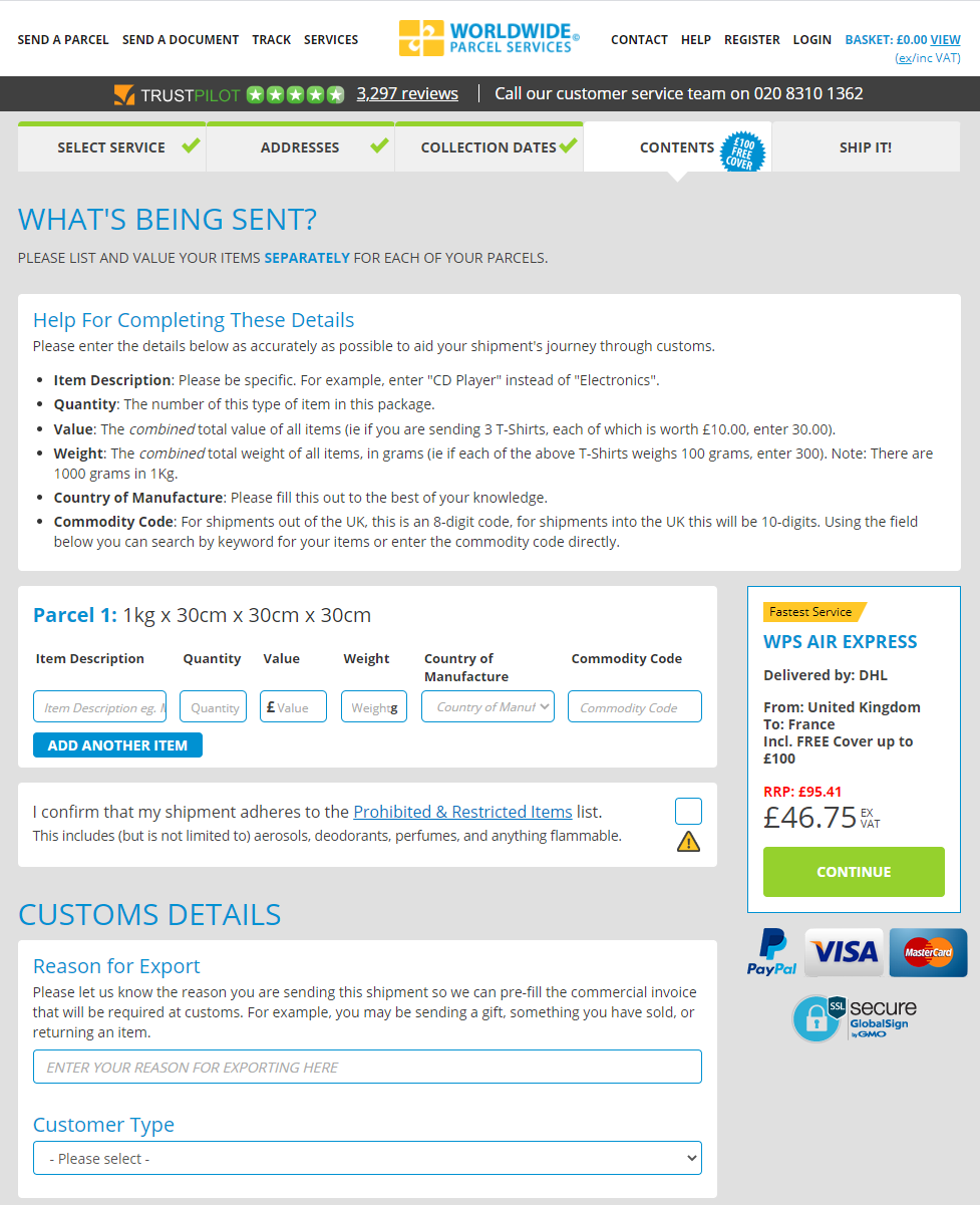 The main change will be that when you arrive at the contents and value page, instead of just entering, say “clothes value £100” you will need to itemise, i.e., “5 pairs of trousers £50” and “5 shirts” £50. You will also need the commodity/harmonising code for your items. These will need to be entered on separate lines as shown in the screenshot from our website below
